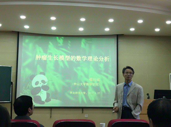 崔尚斌教授的报告内容由生物学背景简介、肿瘤模型简介和肿瘤模型数学分析举例等三部分内容组成。在报告会上,崔尚斌教授首先深入浅出地介绍了肿瘤生长模型的国内外研究现状,然后对抑制物作用下的肿瘤生长模型、含多个自由界面的肿瘤生长模型、多种群细胞肿瘤生长模型和具有流体组织的肿瘤模型等从问题的提出、数学模型的建立、理论分析等方面进行了系统深刻的讲解。崔尚斌教授的报告会分两次进行,整个报告会生动有趣、精彩纷呈,使在场师生受益良多。