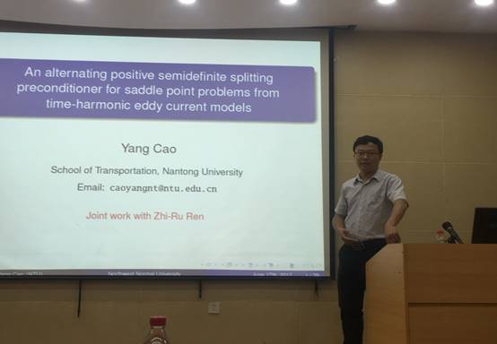 6月17日,应williamhill英国官网邀请,南通大学曹阳副教授来公司在教学9号楼C101学术报告厅作了题为《An alternating positive semidefinite splitting preconditioner for saddle point problems from time-harmonic eddy current models》的学术报告。报告会由williamhill英国官网张贵仓教授主持,相关专业师生40余人参加了此次报告会。