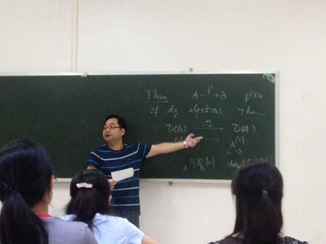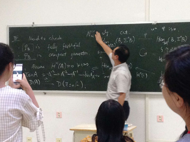 期间,李利平教授的系列讲座从上同调群的表示稳定性起源讲起,阐述了FI-模和表示稳定性的具体关系,FI-模范畴中的相对投射对象的构造,表示稳定性理论可以获取一些同调群的渐进信息,以及推广了的同调稳定性理论。鲍炎红教授从Operad 理论的背景讲起,详细讲述了Operad系统的构成,和基于Operad系统的代数的相关定义,具体计算了一些代数的GK维数,举例说明了Operad 理论在物理等学科的相关应用。叶郁教授从微分分次代数的定义讲起,阐述了微分分次代数上的微分分次模的具体定义,微分分次模的同伦范畴和导出范畴的构造,并详细解释了这种同伦范畴和导出范畴的Frobenius结构。