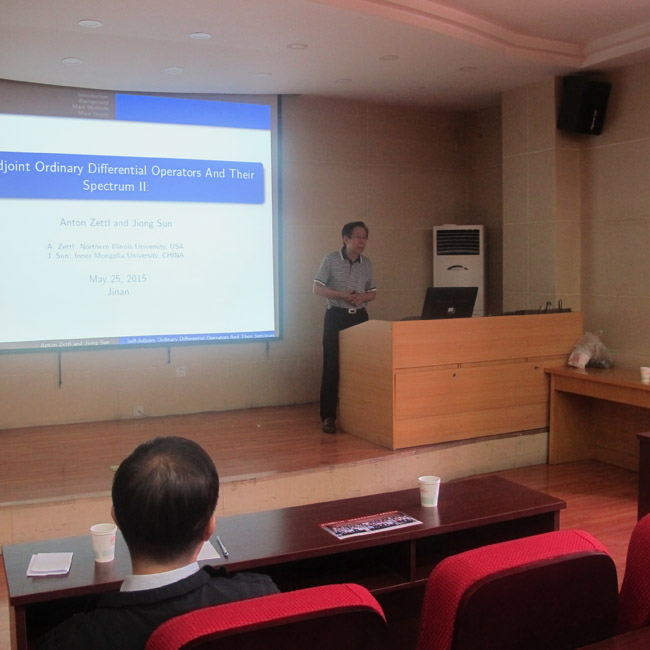 报告中,孙炯教授介绍了正则S-L边值问题、奇异S-L边值问题、最大最小算子及其定义域、自伴微分算子及算子自伴的边界条件、自伴微分算子的GKN理论以及自伴微分算子的谱理论。讲座内容层层深入,环环相扣,使得在场师生收获颇丰。