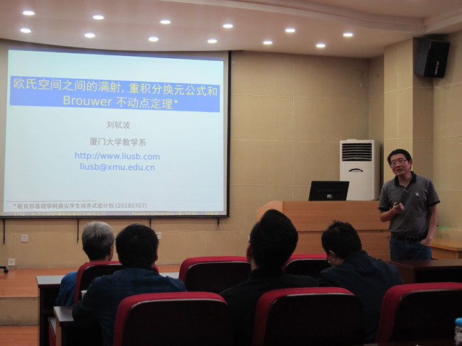 9月15日,应公司邀请,厦门大学刘轼波教授来公司在9号楼C101报告厅作了题为《欧氏空间之间的满射, 重积分换元公式和Brouwer不动点定理》的学术报告。报告会由williamhill英国官网伏升茂教授主持,相关专业师生60余人参加了报告会。