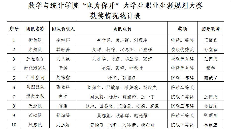 经公司初赛、复赛和校级复评、决赛,公司“衡勇队”获得校级二等奖,“启航队”、“五粒瓜子队”、“时代潮流队”获得校级优秀奖,“仙性空间”团队获得院级一等奖,“明煦战队”、“燃梦之队”获得院级二等奖,“天选队”、“茗心队”、“风启队”获得院级三等奖,辅导员王回成获得“优秀指导教师”荣誉称号。