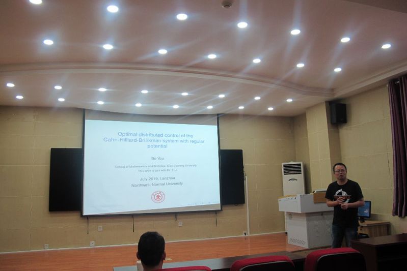 尤波副教授主要汇报了带有光滑位势的Cahn-Hilliard -Brinkman系统的最优分布控制问题。他首先简单介绍了Cahn- Hilliard-Brinkman系统的实际应用背景,然后详细介绍了带有光滑位势的Cahn-Hilliard-Brinkman系统的最优分布控制的存在性、正则性以及最优控制的精确刻画,最后介绍了Cahn-Hilliard-Brinkman系统的最优分布控制方面还未解决的问题,并且分享了自己的研究经验。报告结束后,尤波副教授就与会师生提出的相关问题作了解答。