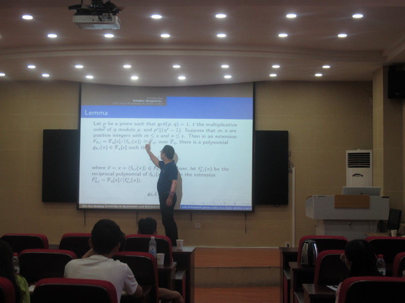 报告中,岳勤教授首先介绍了在有限域Fq中,有限阿贝尔P群G和群代数Fq (G)的基本概念,总结了在群代数Fq(G)中发现的所有的本原幂等元和极小阿贝尔群码。此外,还给出了Fq(G)的所有LCD阿贝尔码(带互补对偶的线性码)和自正交阿贝尔码。