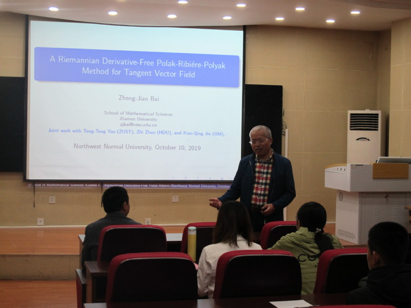 10月10日上午,应公司邀请,厦门大学白正简教授在9号楼C101报告厅作了题为《A Riemannian Derivative-Free PRP Method for Tangent Vector Field》的学术报告。报告会由缪树鑫副教授主持,相关专业师生约40人参加了报告会。