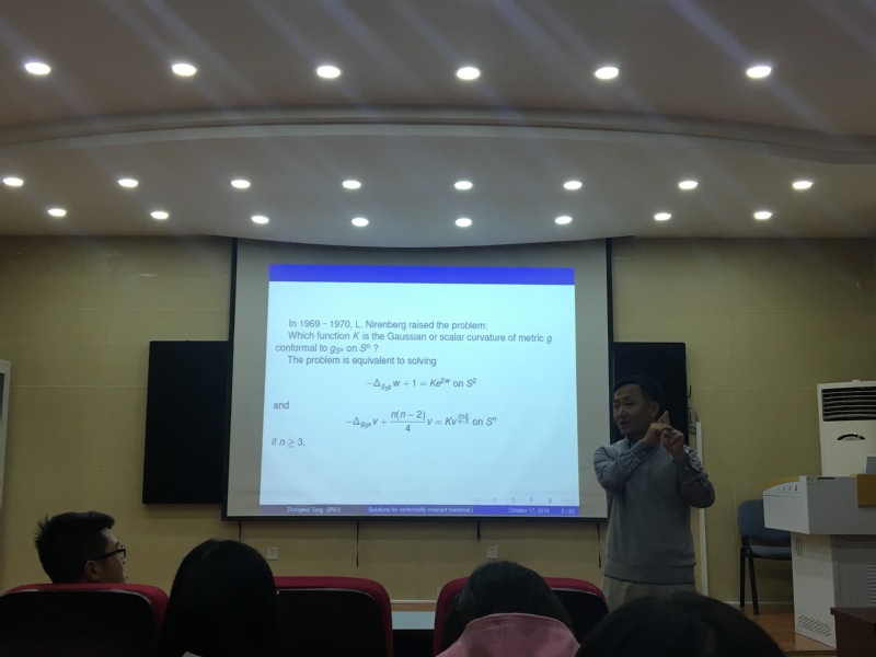 10月17日,应公司邀请,北京师范大学唐仲伟教授来公司进行学术交流,并在教学9号楼C101学术报告厅作了题为《Solutions for conformally invariant fractional Laplacian equations with multi-bumps centered in lattices》的学术报告。报告会由伏升茂教授主持,相关专业师生40余人参加了此次报告会。