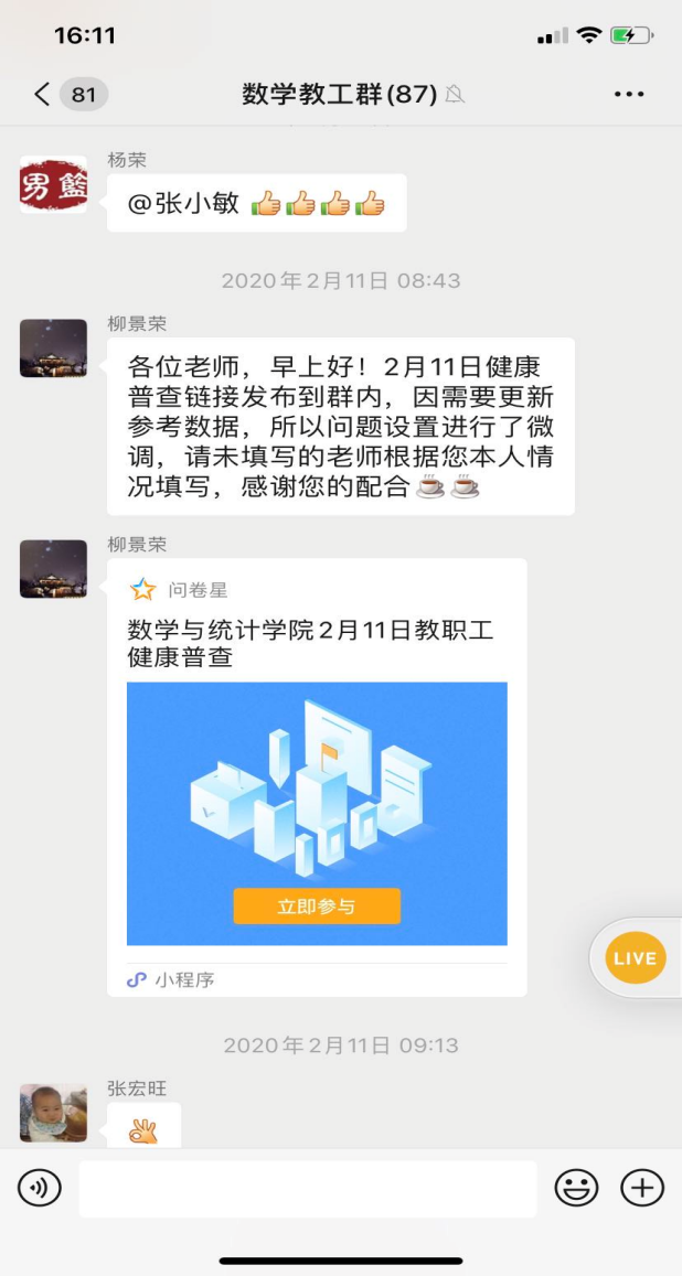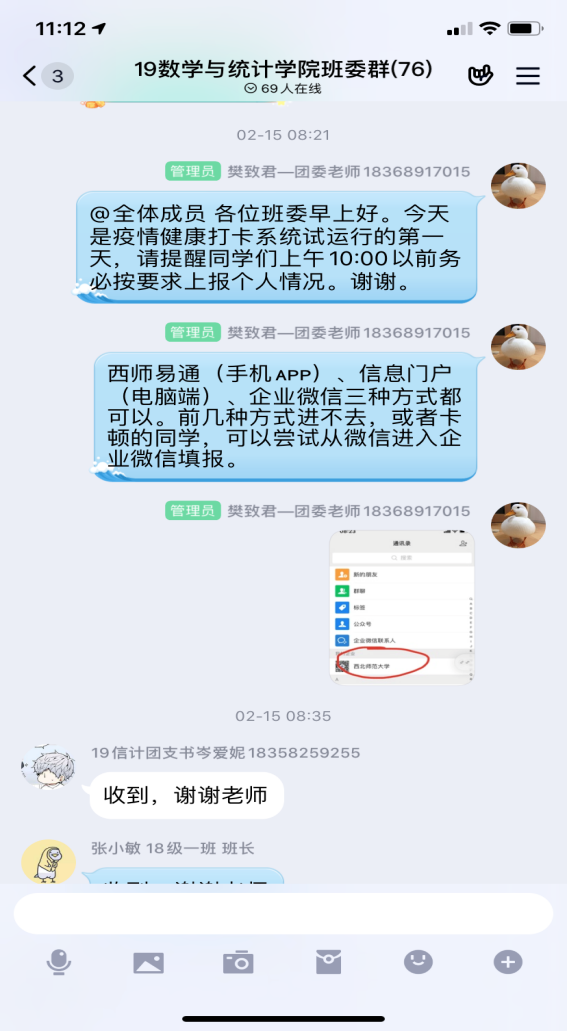 二、严格考勤,强化疫情防控报告制度。根据公司疫情防控工作要求,常正霞书记作了进一步统筹安排,严格执行疫情防控“日报告、零报告”制度,对全院师生每日进行双线排查。安燕副经理、张宏旺主任和辅导员柳景荣积极配合师大社区每日对公司80余名教职工进行健康普查和出行登记;王玮副书记、研究生秘书马成龙、辅导员樊致君、研究生导师和22位班主任每日督促公司1295名员工进行疫情日报打卡,构筑“公司领导-班主任-辅导员”三级防御模式,全面掌握员工情况,及时传达公司通知。