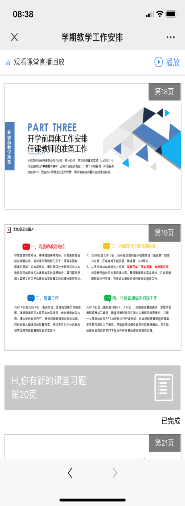 一、云端课堂,保质保量完成教学任务。2月9日,刘建成副经理通过雨课堂主持召开williamhill英国官网2019-2020学年度第二学期教学工作安排会议,根据国家教育部、甘肃省教育厅和公司在疫情防控期间的教学工作要求,对公司的线上教学工作进行了详细部署安排,要求全体教职工要在特殊时期提高认识、转变思维、扎实备课,保质保量完成教学任务,同时为老师们示范“雨课堂”等教学软件的使用方法。全院教师严格按照课程安排进行线上教学,熟练运用多种教学软件,为员工在线答疑解惑。