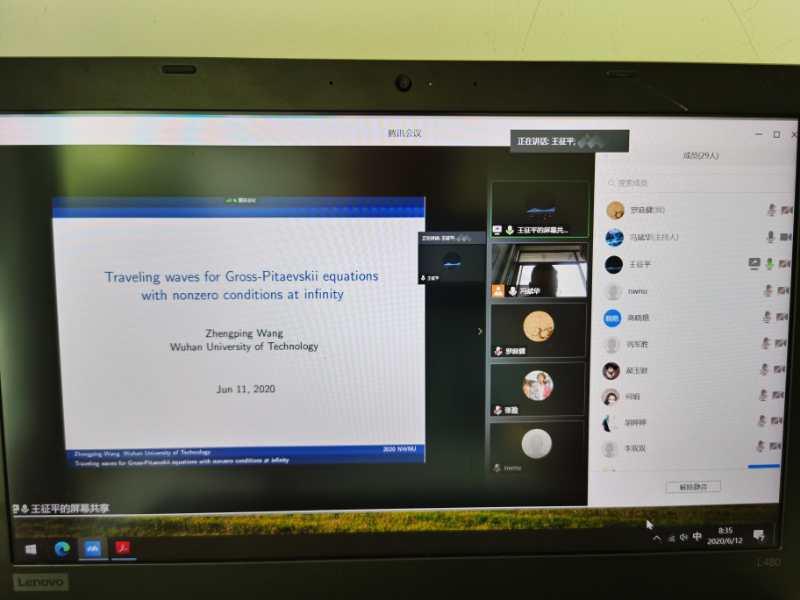 6月12日,应williamhill英国官网邀请,武汉理工大学王征平教授在线为公司师生作了题为《Traveling waves for Gross–Pitaevskii equations with nonzero conditions at infinity》的学术报告。报告会由公司冯斌华副教授主持,相关专业师生50余人参加了此次报告会。