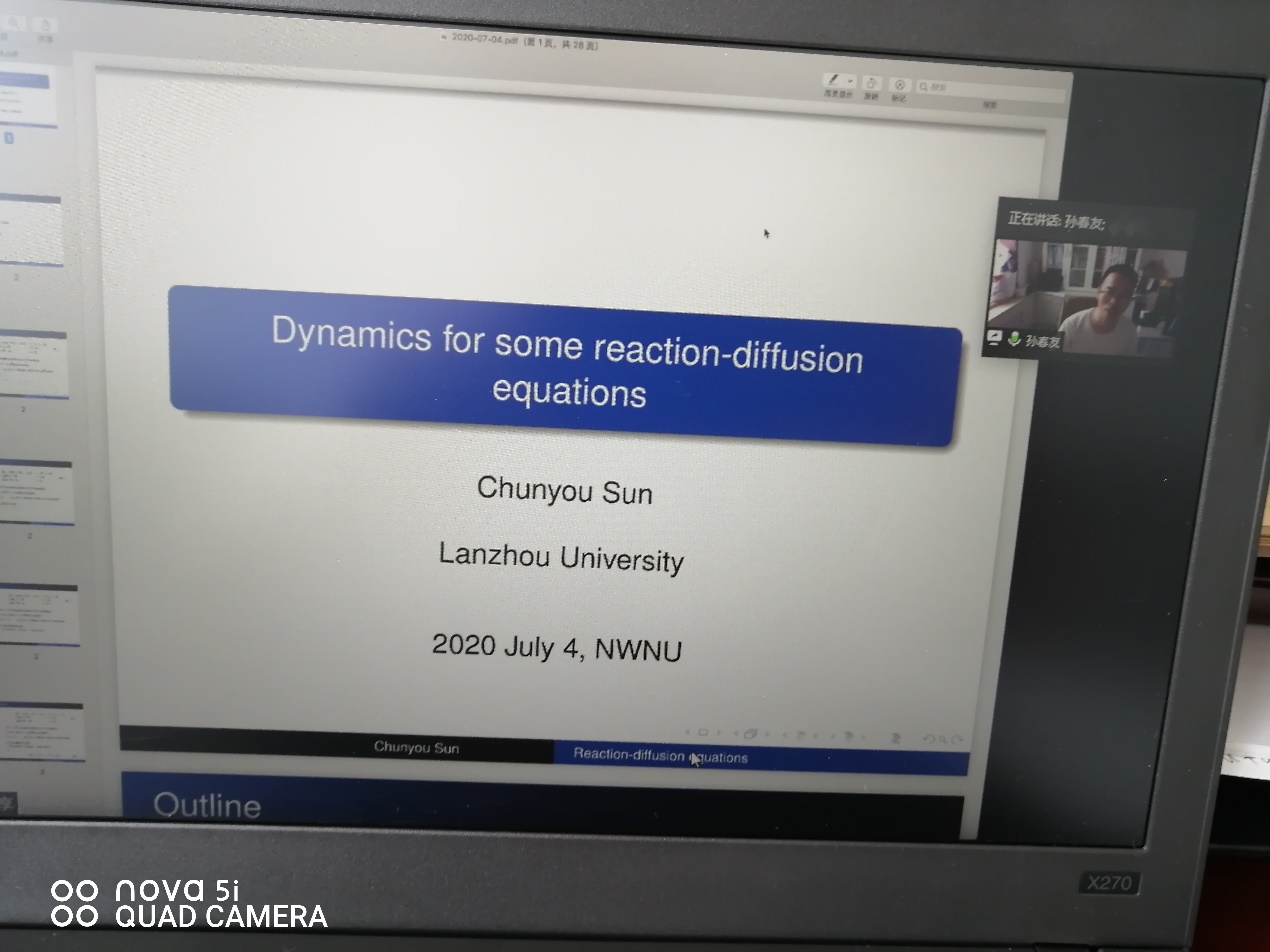 7月4日,应公司邀请,兰州大学孙春友教授在线为公司师生作了题为《Dynamics for some reaction-diffusion equations》的学术报告。报告会由公司马巧珍教授主持,相关专业师生50余人在线收听了报告。