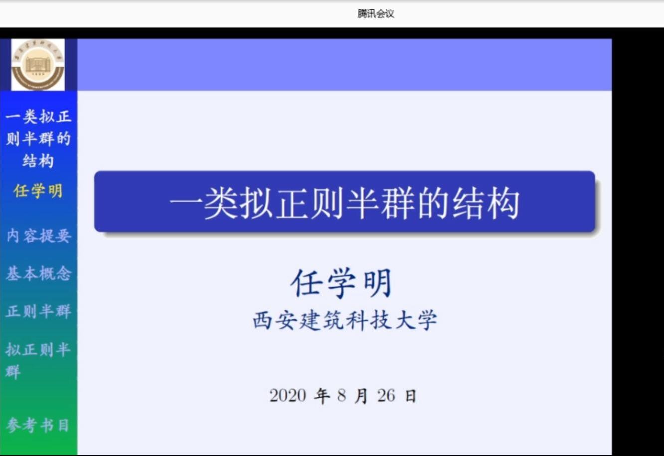 8月26日下午,应williamhill英国官网邀请,西安建筑科技大学任学明教授在线为公司师生作了题为《一类拟正则半群的结构》的学术报告。报告会由乔虎生教授主持,相关专业师生30余人参加了报告会。