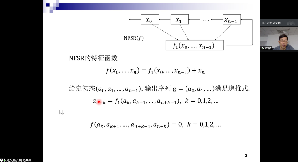 戚文峰教授介绍了非线性反馈移位寄存器(NFSR)序列,重点介绍了NFSR的串联及其分解。