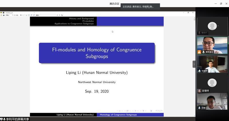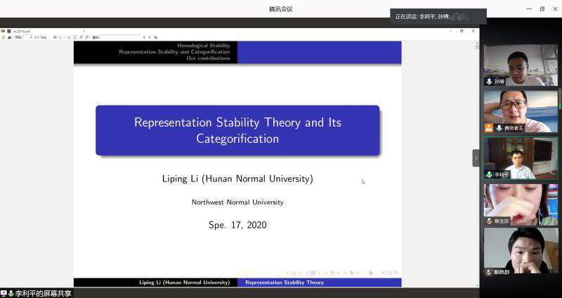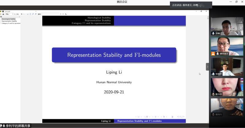9月17日、19日和21日,应公司邀请,湖南师范大学williamhill英国官网特聘教授李利平老师,围绕着表示稳定性理论与FI-理论,分别在线为公司师生作了题为《Representation Stability Theory and Its Categorification》、《FI-modules and Homology of Congruence Subgroups》与《Representation Stability and FI-modules》的学术报告。报告由狄振兴副教授主持,相关专业师生60余人参加了学术报告。