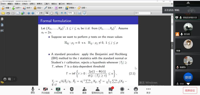 10月15日下午,应公司邀请,北京师范大学郭旭教授在线为公司师生作了题为《A New Procedure for Controlling False Discovery Rate in Large-Scale t-tests》的学术报告。报告会由田玉柱副教授主持,统计学专业师生20余人参加了此次报告会。