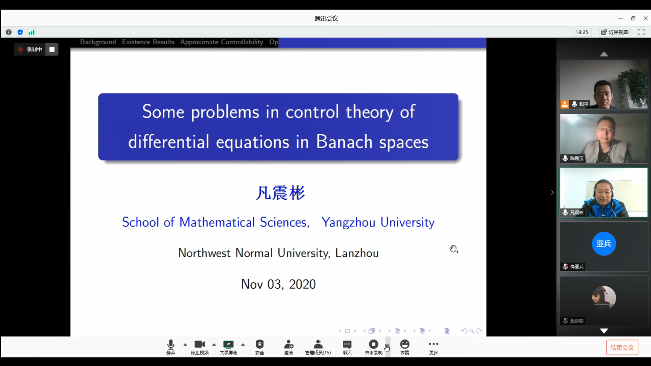 报告中,凡震彬教授首先介绍了发展方程控制问题的发展历程,然后详细介绍了他们团队最近几年在发展方程控制问题方面的主要研究成果,最后给出了一些值得进一步讨论的问题。