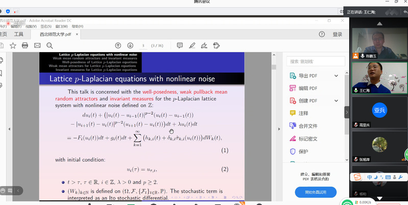 报告中,王仁海博士首先简单介绍了离散p-Laplacian方程长期动力学行为及不变测度的研究背景、研究进展及相关应用,然后详细介绍了Bochner空间中弱拉回吸引子的最新研究结果以及他们研究团队如何克服困难并利用一致尾部估计方法获得吸引子及不变测度的紧性,在非线性漂移项和扩散项局部连续时,获得问题弱拉回随机吸引子的存在唯一性及不变测度的存在性。报告结束后,王仁海博士就与会师生提出的相关问题作了解答。