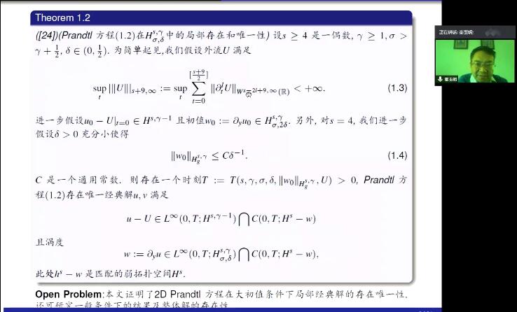 秦玉明教授首先介绍了Prandtl方程的研究背景,并从二维Prandtl方程、二维可压边界层方程、三维Prandtl方程等方面对Prandtl方程研究进展详细介绍,并详细讲解了研究思路、方法以及目前研究成果。更值得一提的是,秦教授给出了Prandtl方程的公开研究问题,鼓励研究生们在该领域开展相关研究工作。