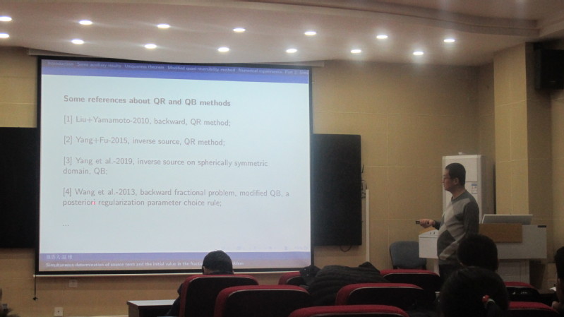 第一阶段的报告会上午9:00开始,报告会由温瑾副教授主持。杨帆副教授作了题为《Unknown source identification problem for time-space fractional diffusion equation》的报告,介绍了时间分数阶扩散波方程的背景意义和求解源项识别问题的两种正则化方法,并且给出了相关问题的精确解、条件稳定性以及误差估计。孙亮亮副教授作了《Simultaneous identification of the potential term and the fractional orders in a multi-term time-fractional diffusion equation》的报告,介绍了在时间分数阶扩散方程多参数反演问题,并给出了正反问题解的唯一性结果和相关反问题的Levenberg-Marquardt正则化算法。