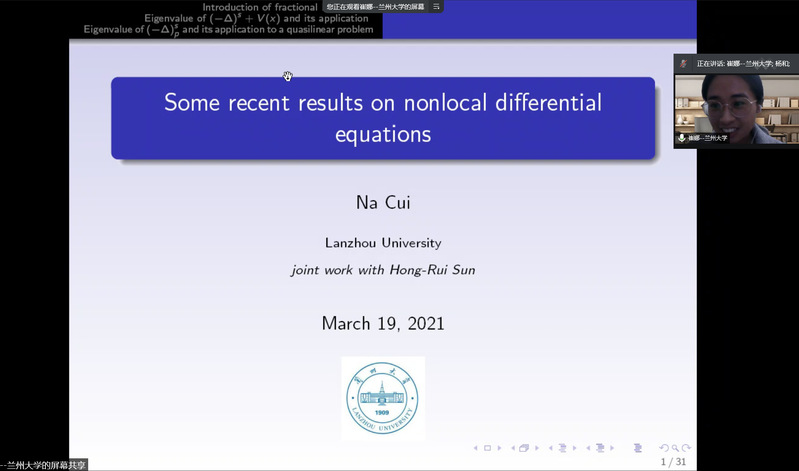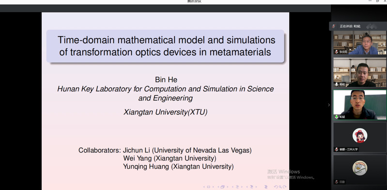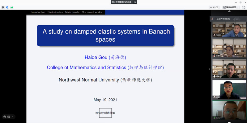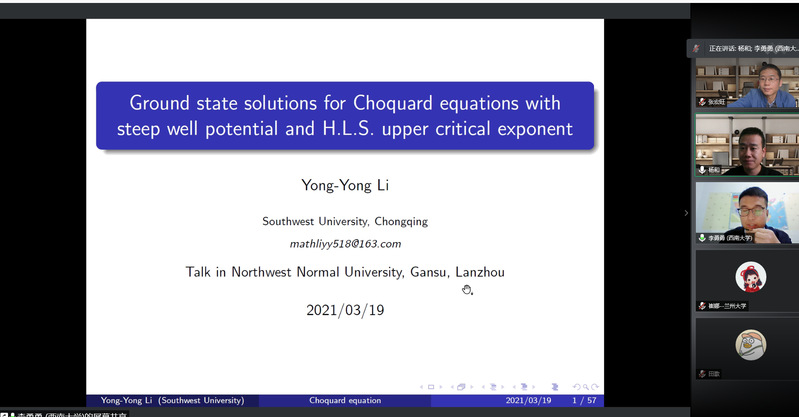 论坛上,5位博士分别做了题为《Some recent results on nonlocal differential equations》、《Spreading speed in a food-limited population model with nonlocal delay》、《Ground state solutions for Choquard equations with steep well potential and H.L.S. upper critical exponent》、《A study on damped elastic systems in Banach spaces》、《Time-domain mathematical model and simulations of transformation optics devices in metamaterials》的报告。大家就各自研究领域相关前沿问题进行了分享交流,与会教师参与了探讨。