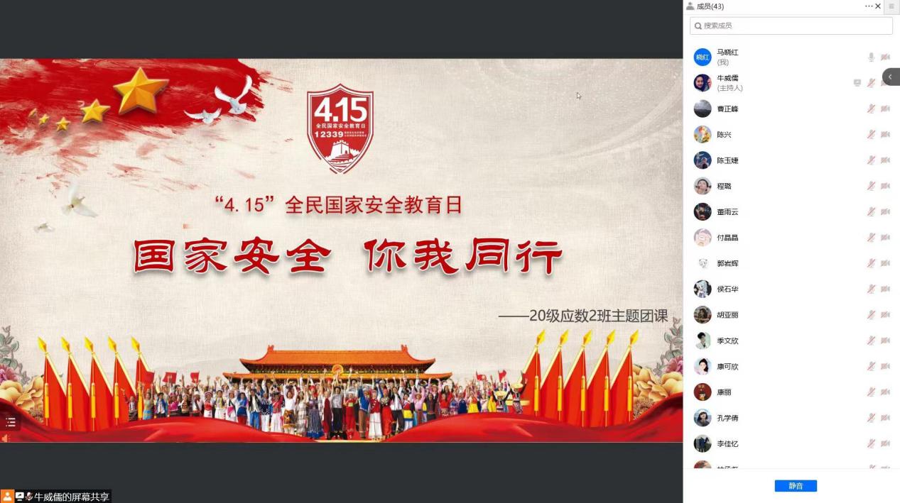 2020级数学与应用数学2班团支书牛威儒说:“主题团课,提高了同学们的国家安全意识,让同学们对国家安全知识有了深入的了解,把国家安全相关知识、维护国家安全意识以及总体国家安全观植入同学们的心中,也激发了同学们的爱国情感。作为新时代的高校学子,我们要主动了解国家安全知识,主动承担起维护国家安全的责任和义务,坚持总体国家安全观,将维护国家安全内化于心、外化于行。”