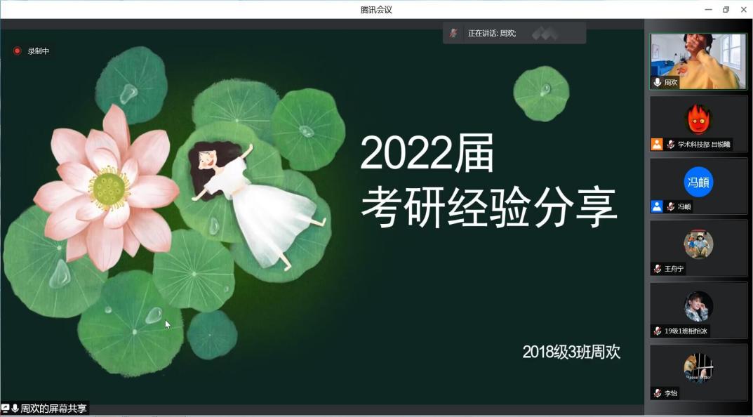 本期分享会为考研员工篇(二),于4月14日晚19:30在腾讯会议进行,公司分别邀请了2018级数学与应用数学1班王西文,2018级数学与应用数学2班景娜,2018级数学与应用数学3班周欢、张伟一四位同学作为代表为学弟学妹分享考研的心得与经验。