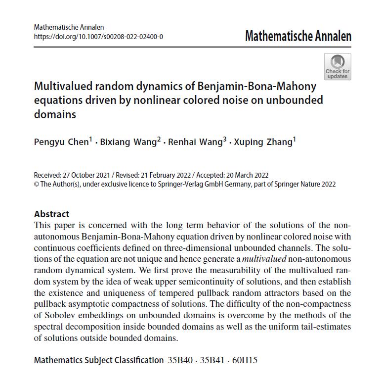 近日获悉,公司青年教师陈鹏玉和张旭萍与美国New Mexico Technology大学王碧祥教授、王仁海博士合作在Mathematische Annalen (德国数学年刊)上发表了题为“Multivalued Random Dynamics of Benjamin-Bona-Mahony Equations Driven by Nonlinear Colored Noise on Unbounded Domains”的学术论文(论文链接:https://link.springer.com/article/10.1007/s00208- 022-02400-0),实现了公司学者在该刊发表论文零的突破。Mathematische Annalen是数学界公认的国际顶级期刊,有着非常高的学术影响力。著名数学家克莱因、希尔伯特曾先后担任该刊主编,著名物理学家爱因斯坦也曾担任编委并在该刊发表两篇重要的论文。该刊以选稿严格著称,曾发表许多奠基性研究成果。
