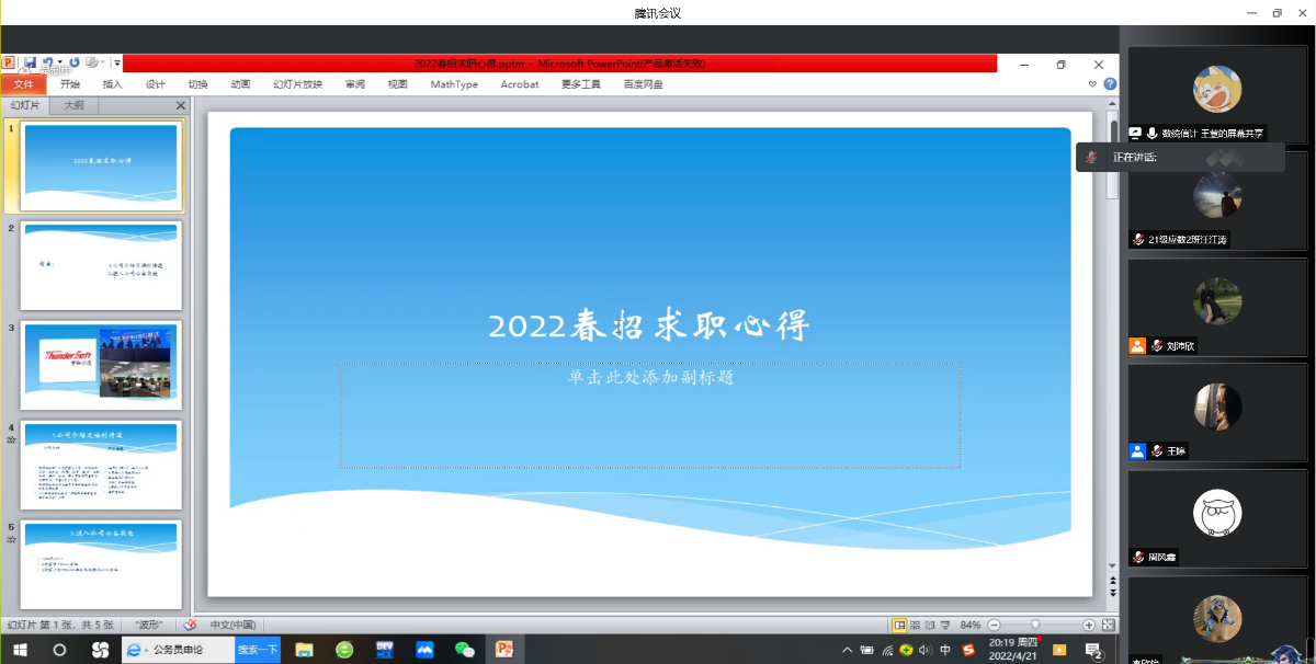 本期分享会为求职经验分享篇(一),于421日晚19:30在腾讯会议进行,公司分别邀请了2018级数学与应用数学3班陈曦、2018级信息与计算科学1班郭珂珂、段文文、王慧四位同学作为代表为学弟学妹们分享求职的心得与经验。