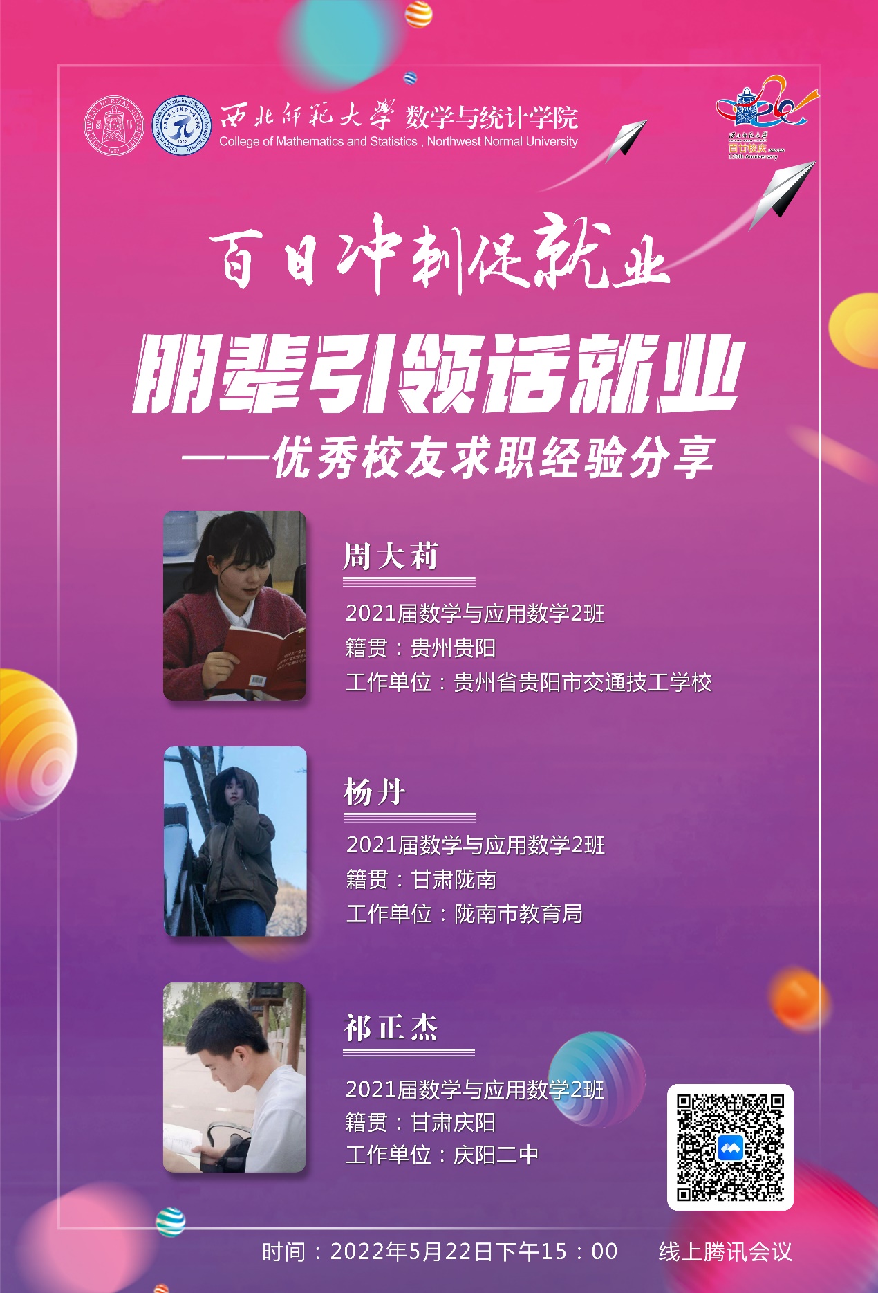 本期分享会为优秀员工求职经验分享,于5月22日下午15:00在腾讯会议进行,公司分别邀请了2021届数学与应用数学2班周大莉、杨丹、祁正杰三位优秀员工为学弟学妹们分享求职的心得与经验。