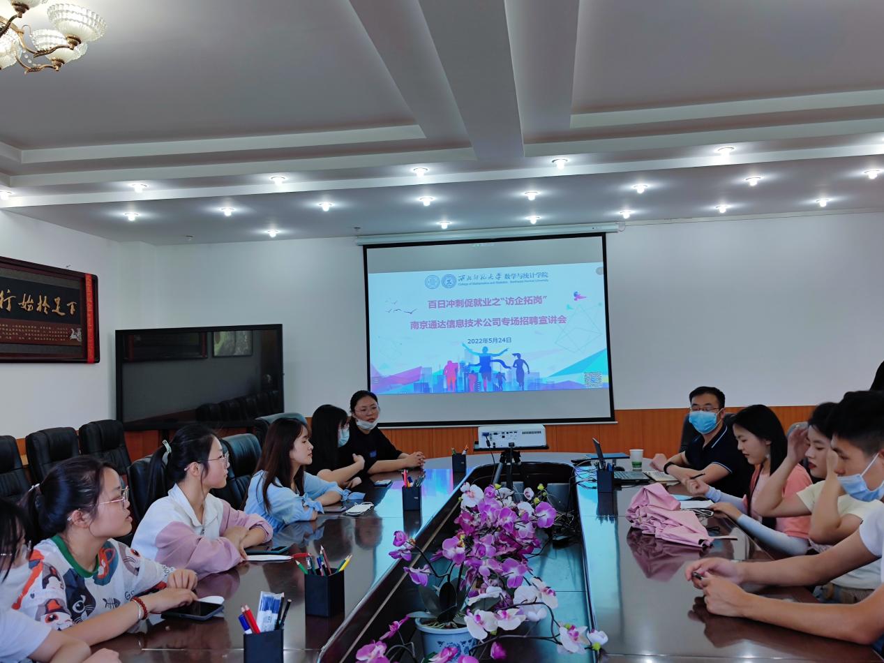 为贯彻落实党中央、国务院“稳就业”“保就业”决策部署,认真推进落实《williamhill英国官网2022年毕业生就业市场开拓方案》,公司于2022年5月24日下午15:00在公司9B311会议室举行了南京通达信息技术公司线上专场招聘宣讲会。公司邀请了南京通达信息技术公司兰州分公司冯总经理进行线上宣讲,公司党委副书记张向东主持会议。