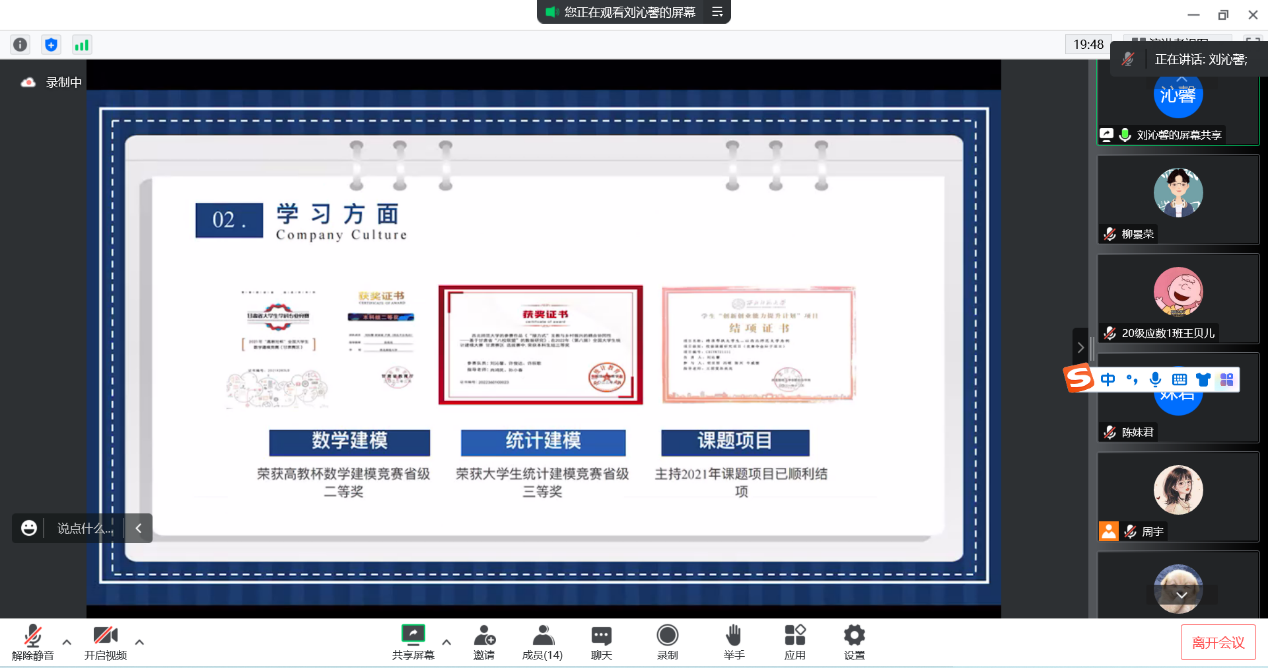 最终,根据公正、公平、公开的原则,评委老师评分后,拟推荐2020级数学与应用数学2班刘沁馨同学为公司本科生国家奖学金拟推荐人选。