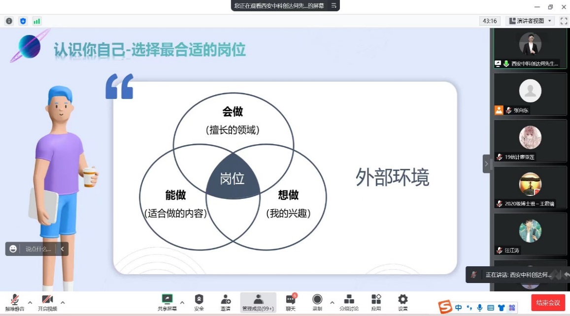 宣讲会上,西安中科创达软件有限公司校园招聘经理——何家乐,从选择适合的岗位、公司的业务能力、人才培训、团队氛围、薪资福利及业务方向及工作岗位等方面进行了详细讲解,诚挚的表达了希望公司学子能加入西安中科创达软件有限公司,为企业注入新活力的愿望。