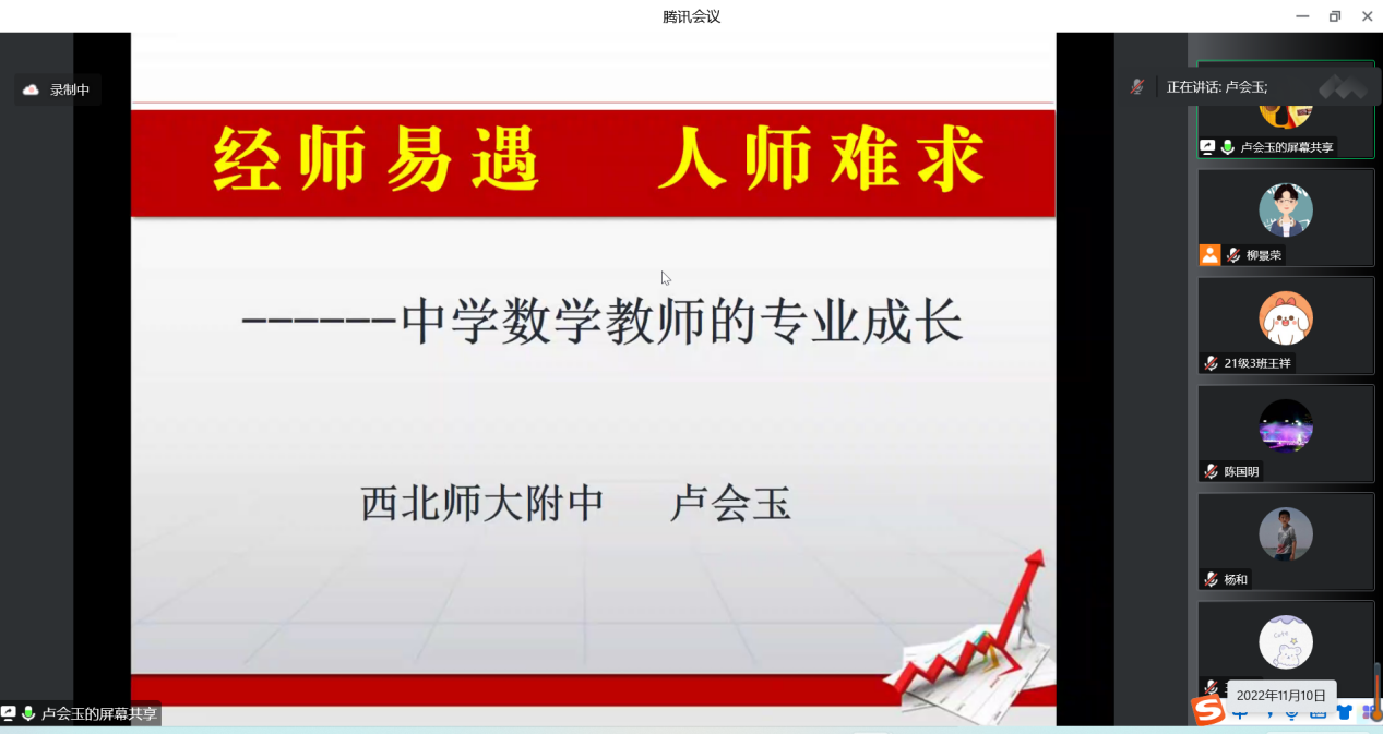 11月10日晚,公司在线上举办名师讲堂第三期讲座。讲座邀请“陇原名师”卢会玉作了题为“经师易遇人师难求:中学数学教师的专业成长”的报告,讲座由公司副经理杨和教授主持,共计300余人参加了此次讲座。