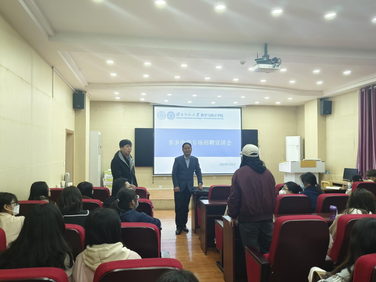 会上,东乡中学负责人从临夏州东乡中学的区位优势、办学条件、薪资待遇、未来的职称晋升、发展前景等方面进行了详细的说明。鼓励同学们要对自己的未来有一个清晰的认识和规划,转变就业观念,抓住就业机会,要有服务基层的意识,把个人成长与民族复兴伟业紧密联系起来,珍惜难得机遇,投身创业沃土,用个人所学和专业所长服务临夏高质量发展,展现新时代青年学子的使命担当和精神风貌。参会的同学们就自己关心的问题进行了提问。