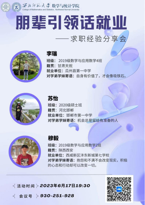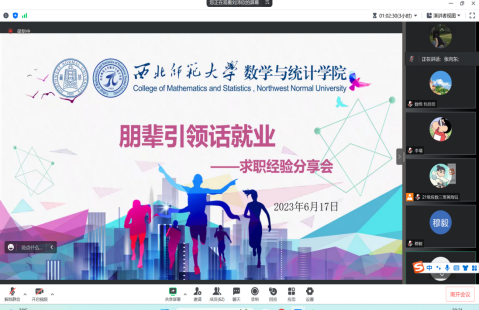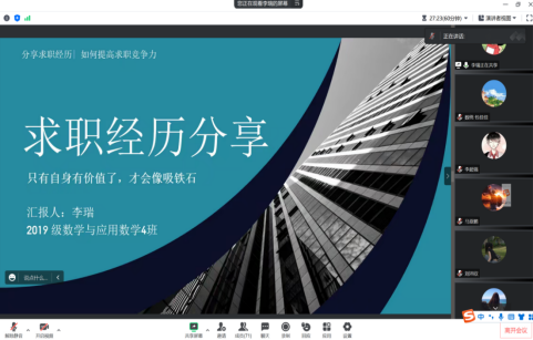 为增强公司员工求职就业竞争力,充分发挥榜样示范以及朋辈引领作用,公司于6月17日19:30举办线上“朋辈引领话就业——求职经验分享会”系列活动第四期,本期邀请了2019级数学与应用数学4班李瑞、2020级硕士班苏怡、2019级数学与应用数学2班穆毅三位同学进行求职经验分享,会议由辅导员包佳佳主持。