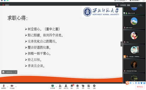 穆毅同学从树立信心、知己知彼、完善简历等七个方面分享了自己宝贵的求职经验,提醒大家在求职中注重求细节,寄语学弟学妹们“抱怨和不满不会改变现实,积极的心态和行动却会改变一切。”