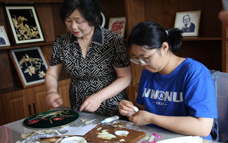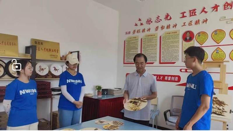 7月30日下午,实践团队前往张掖市山丹县文化馆,寻找省级烙画非遗传承人----张志光老先生和张春玲女士,从对张老先生的访谈中,得知这位传承人36年如一日坚守在传承非遗的岗位上,认真挖掘、潜心研究、不懈努力、坚守初心,怀揣热爱,紧跟时代发展,在漫漫非遗传承路上让“非遗”活起来。两位老师分别为实践队员现场制作烙画和麦秆画,使团队成员们欣赏到了精美绝伦的非遗作品。