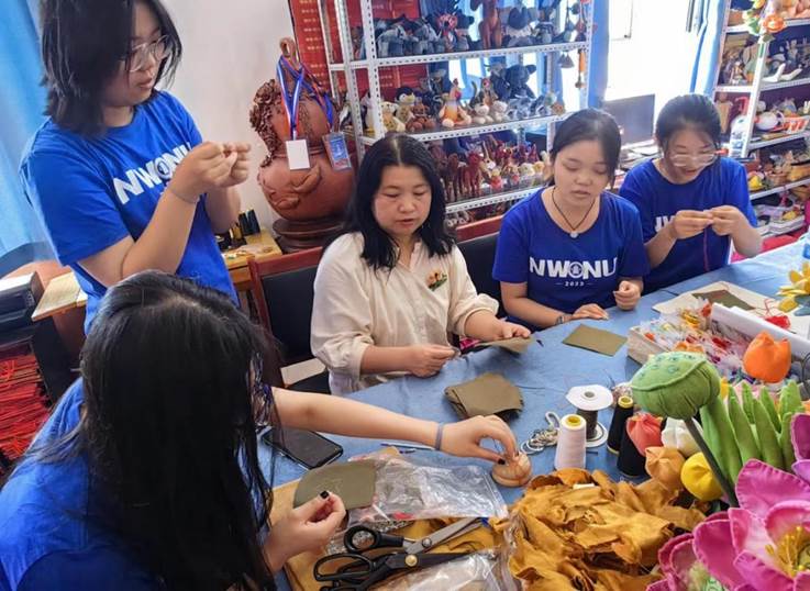 7月29日,实践队员在指导老师周宇的带领下走进甘州扎染传承人---许静和面塑传承人---李凯的工作室,开展非遗文化技艺的调研,并对两位非遗传承人进行访谈和调研。实践队员认真聆听他们的传承故事,切身体会非遗深厚的历史文化和人文魅力,深受震撼。随即,实践队员分别在非遗老师的指导下体验了制作面塑和刺绣的工艺,赢得了两位非遗传承人老师的赞赏。以实际行动感受非遗技艺传承的艰辛。随后,实践团队前往甘州区文化馆参观展览,感受文化独特的魅力。
