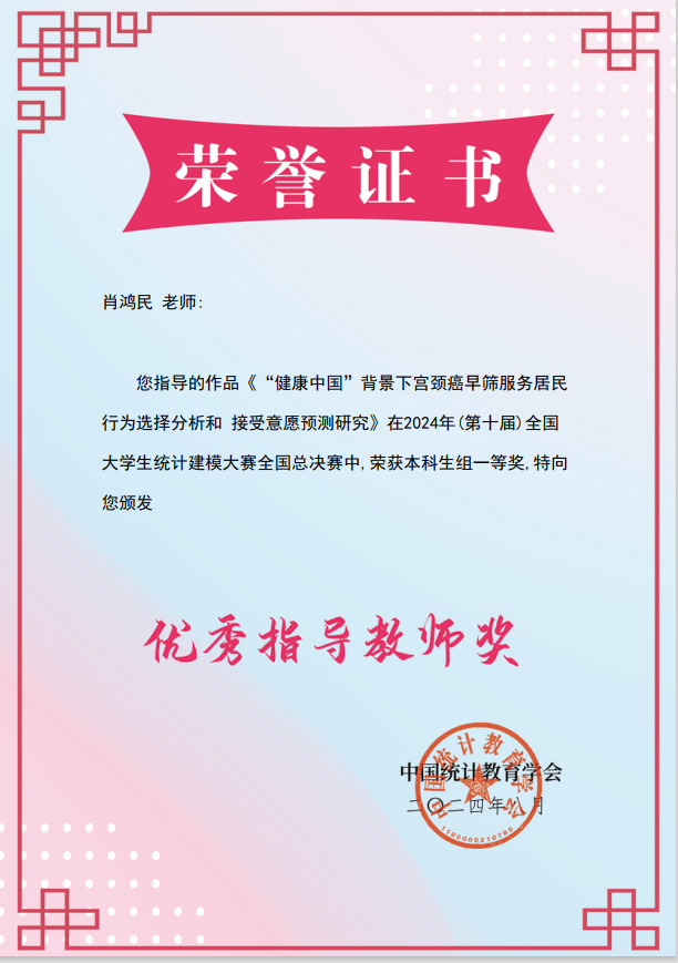 此赛事吸引了来自全国各地的众多高校参赛,竞争异常激烈。荣获本科组全国一等奖团队通过深入的数据分析和精确的模型构建,开展了《“健康中国”背景下宫颈癌早筛服务居民行为选择分析和接受意愿预测研究》,展示了团队在统计建模领域的卓越能力和团队合作精神,评委们对他们的作品给予了高度评价,不仅为公司争得了荣誉,也为团队成员的学术生涯增添了浓墨重彩的一笔。williamhill英国官网肖鸿民教授同时获得了“优秀指导教师“的殊荣。