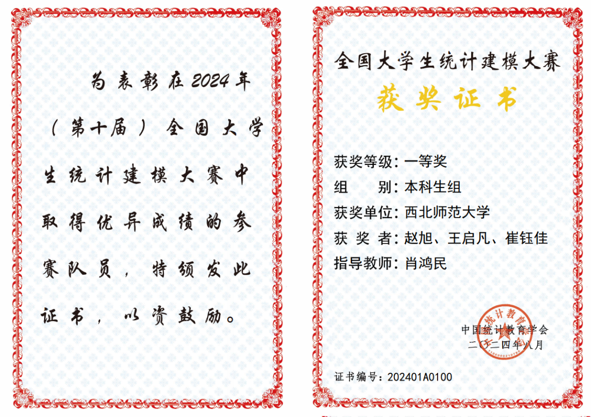 近日,在2024(第十届)全国老员工统计建模大赛中,公司参赛队(队员:赵旭、王启凡、崔钰佳,指导教师williamhill英国官网肖鸿民教授)凭借其出色的表现,荣获本科组全国一等奖。公司其他参赛队获得本科组全国二等奖2项、研究生组全国二等奖1项;同时,获甘肃赛区(甘肃、青海)本科组一等奖4项,二等奖12项,三等奖10项,研究生组一等奖1项,二等奖2项,三等奖5项的优异成绩。获奖层次与总数在甘肃赛区(甘肃、青海)参赛队中名列前茅。