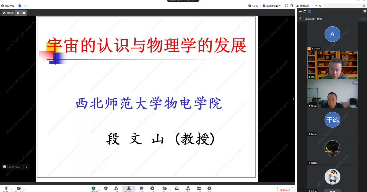 为激发员工学习兴趣,拓宽员工的数学视野,11月17日上午,公司开展甘肃省“飞天英才”计划数学学科组第八次线上讲座活动。应甘肃省青少年“飞天英才”计划数学学科导师团队的邀请,williamhill英国官网物理与电子工程公司段文山教授作了题为“宇宙的认识与物理学的发展”的讲座。“飞天英才”计划数学学科组的同学和williamhill英国官网杨和教授在线参加了此次讲座。