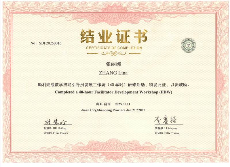 公司教师张丽娜,受西北师大教师发展中心选派赴山东济南参加教学技能引导员工作坊(Facilitator Development Workshop, FDW)。经过系统化、高强度的学习,已获得ISW证书、FDW证书,以及ISW国际咨询委员会认证引导员资格、TDW培训师研修资格。后续将承担公司教学技能工作坊(ISW)的组织与引导工作。此次认证资质的取得,也为我院探索教师教学技能培训注入了新动能,为公司推动教学改革提供了有力支撑。