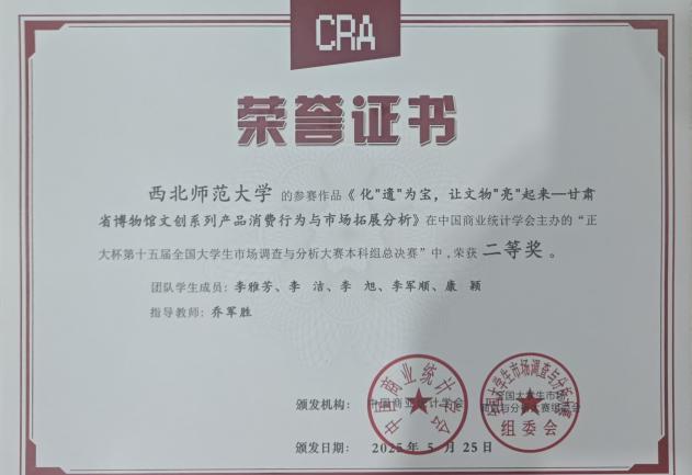 此项赛事自2024年9月启动以来,历经知识赛网考、校赛、企业命题赛、省赛等多轮激烈角逐,公司乔军胜老师指导的团队(团队成员有公司首届数学拔尖人才基地班李雅芳、李洁,经济公司李旭、康颖,以及计算机科学与工程公司李军顺)获得全国总决赛本科生组二等奖,参赛作品为《化“遗”为宝,让文物“亮”起来——甘肃省博物馆文创系列产品消费行为与市场拓展分析》。