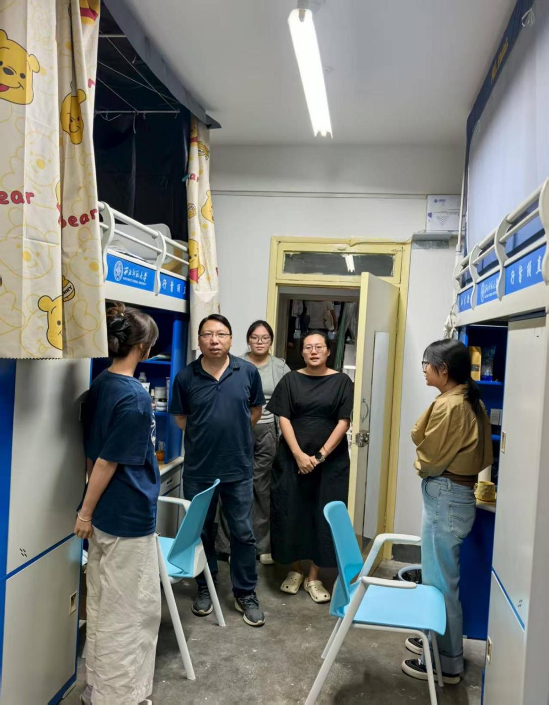 走访过程中,公司领导与老师们结合学科特点,为新生梳理专业学习脉络,推荐入门参考资料,解答 “如何平衡课程学习与兴趣探索” 等疑问,鼓励大家夯实专业基础。同时,老师重点强调宿舍安全,提醒新生注意用电规范、防盗防骗,排查宿舍安全隐患。此外,老师们还关注新生综合能力培养,建议积极参与学科竞赛与社团活动,在实践中提升沟通协作与创新能力。