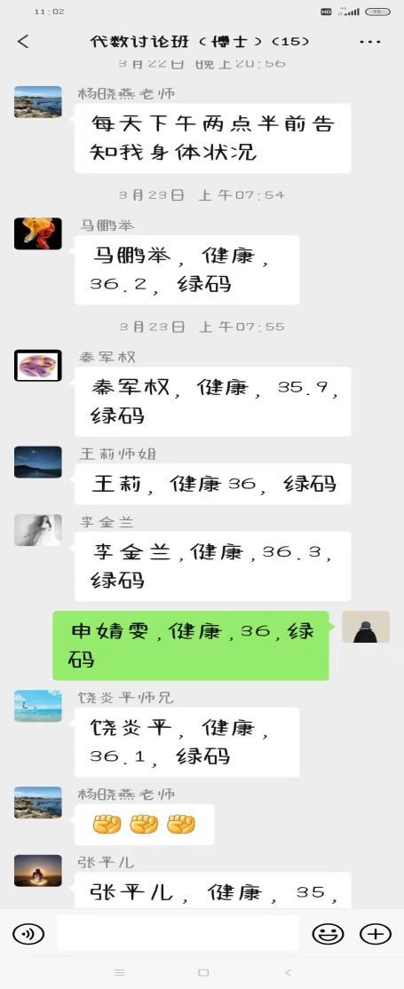 博士生导师杨晓燕教授几乎每天都会与员工通过微信视频交流论文,为他们答疑解惑。要求自己的研究生每日群打卡上报体温、健康状况、健康码情况,并及时向驻点辅导员上报。她说道:“作为一名导师,我用自己力所能及的方式,为抗击疫情贡献心力。在研究生群里转发公司对疫情防控的要求,转发一些调解情绪的小技巧,布置每周的学习任务,还鼓励员工要锻炼身体。希望员工在疫情期间,一定要经得起考验。一是要振奋精神,相信师大党委的领导。二是要自律学习,养成良好的作息习惯,提高学习的自觉性,真正做到“学习不延期”。三是要着眼未来、坚定理想。希望所有同学牢记以上几点,静候春暖花开。”